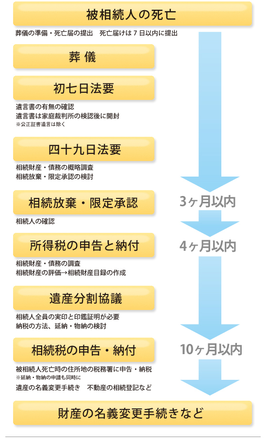 相続は被相続人(=相続される人)が、亡くなったときから開始されます。 相続については、民法で細かい規定が定められていますが、実際は被相続人や相続人の意見を、尊重することを優先して考えられています。 このため、遺言書の有無や相続人全体の話し合いを重視しており、これによって相続の手続きも変わってきます。 以下は、相続手続き全体の流れを、一般的な葬儀とあわせて図にしたものです。